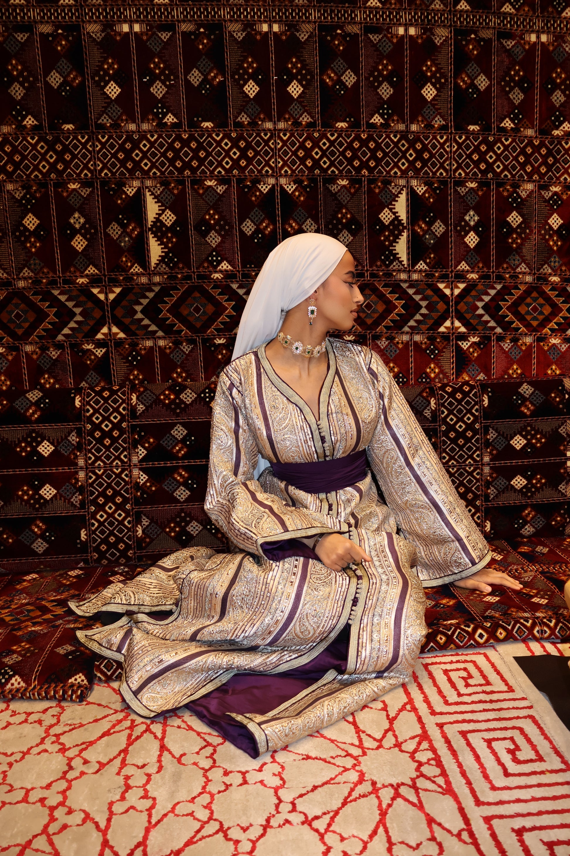 Ce caftan en brocart violet incarne le raffinement et la majesté. Son tissu riche, agrémenté de motifs scintillants, est sublimé par des détails soigneusement travaillés. Avec sa ceinture ajustable, ce modèle taille unique s'adapte parfaitement à toutes les morphologies, offrant confort et élégance pour vos plus belles occasions.