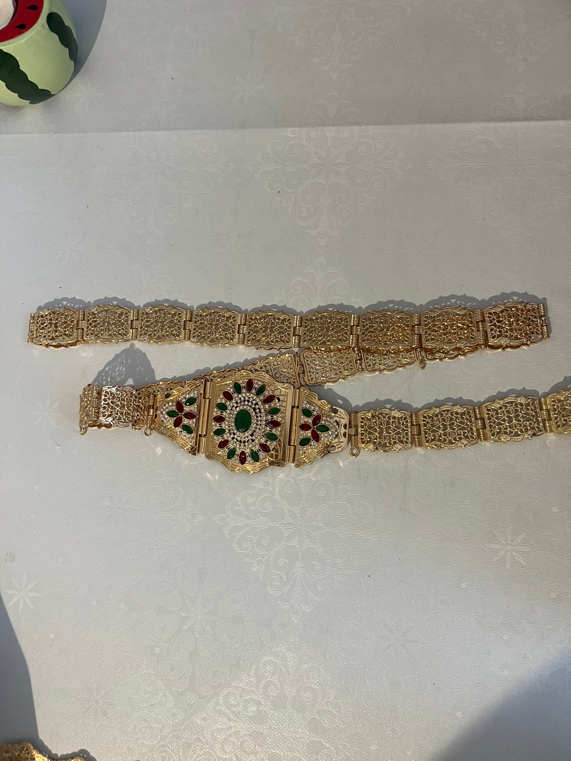 Cette ceinture dorée, verte et rouge apporte une touche de tradition à toutes les tenues. Elle convient à toutes les tailles, sauf les plus fines.