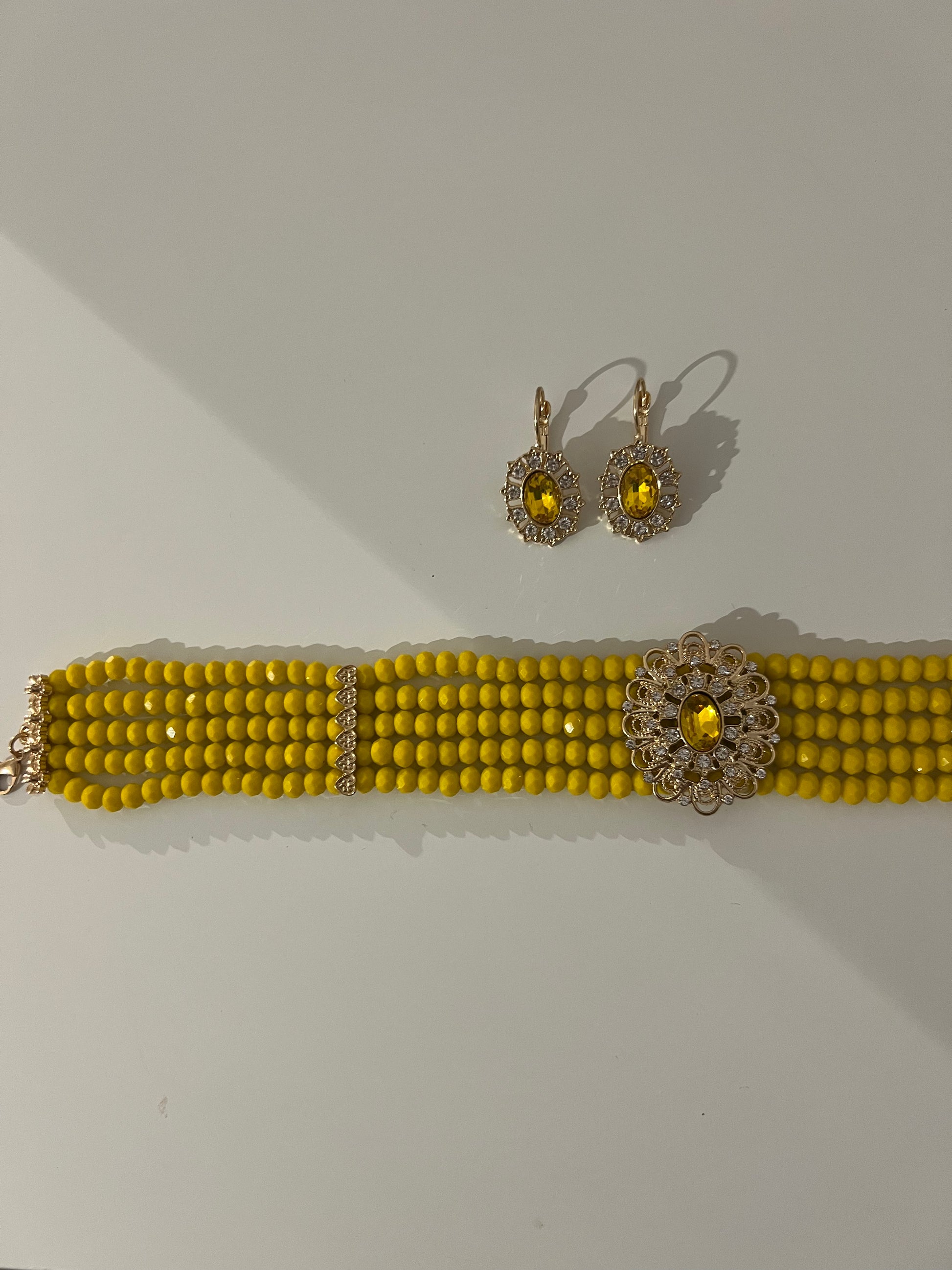 Ce collier ras de cou jaune est accompagné de boucles d'oreilles assorties pour compléter votre look.