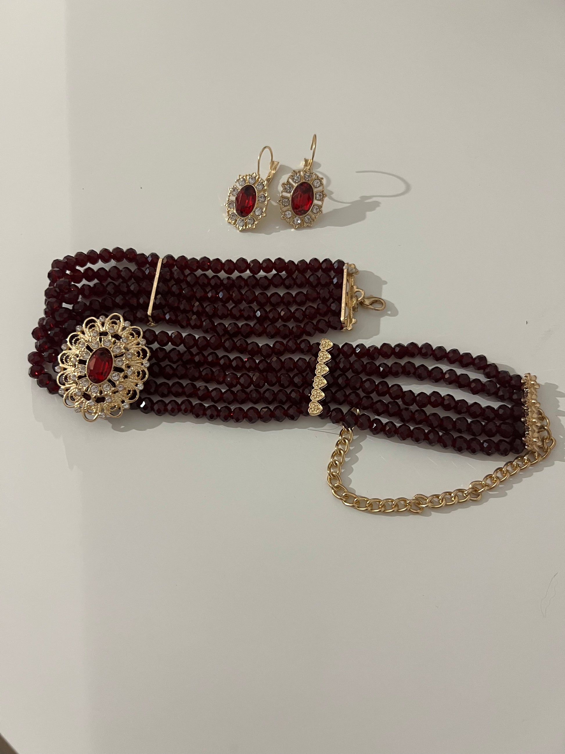 Ce collier ras de cou bordeaux est accompagné de boucles d'oreilles assorties pour compléter votre look.