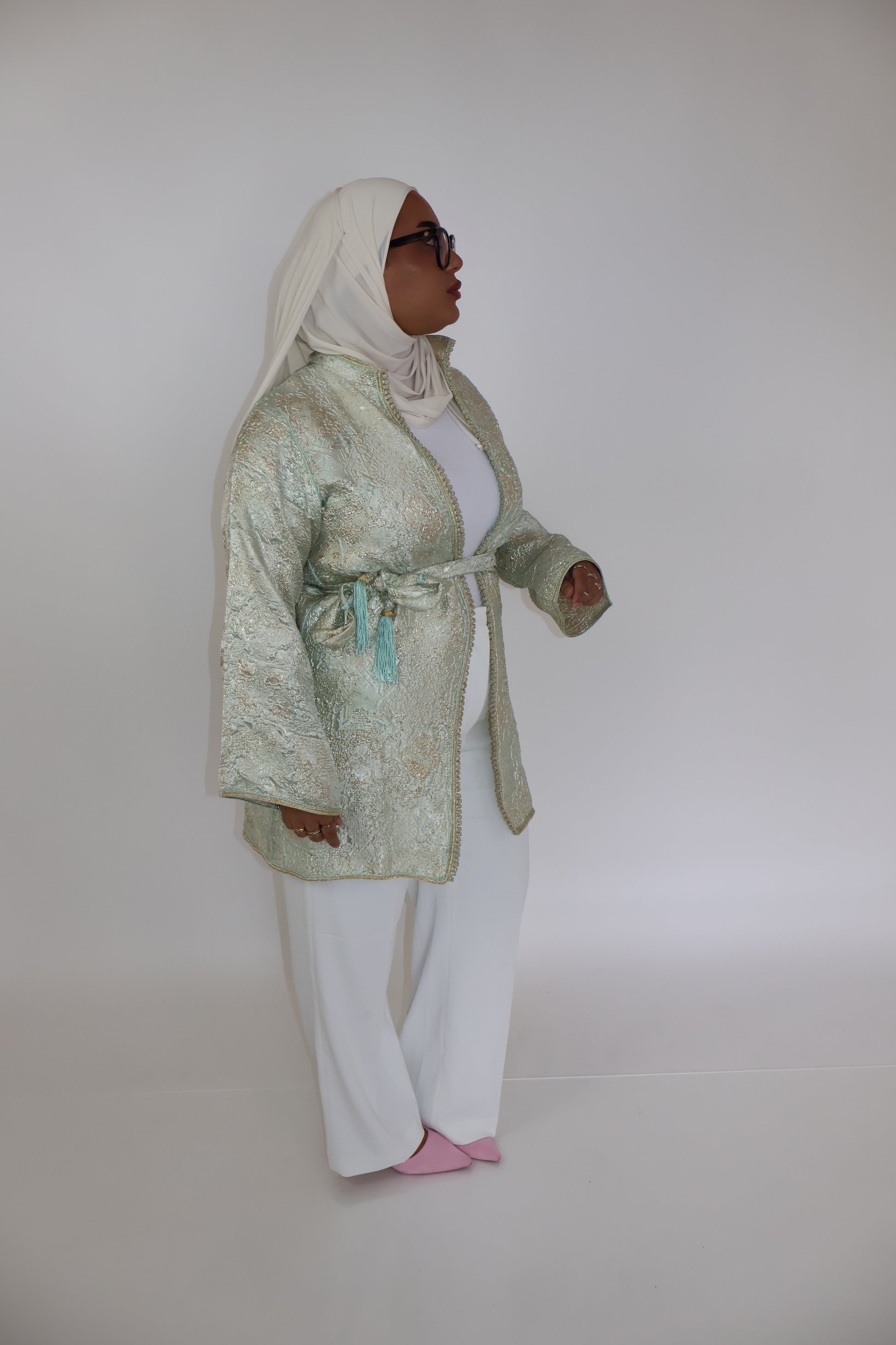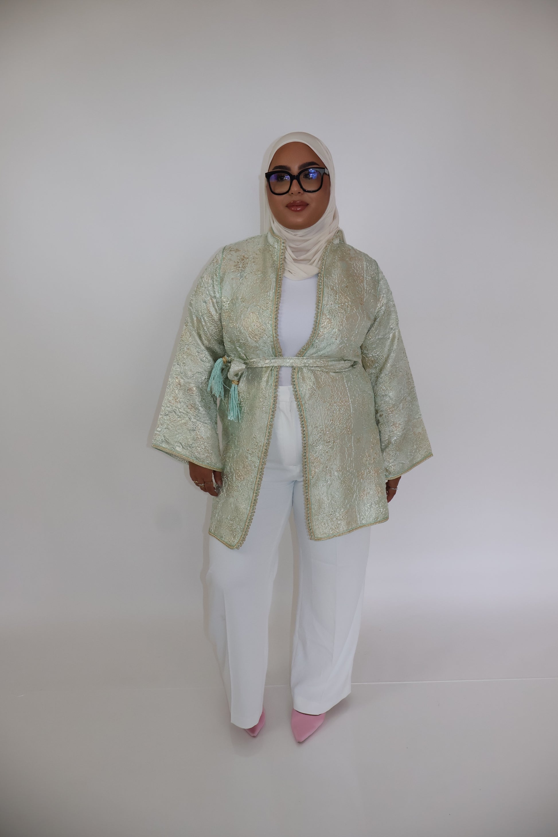 Léger et élégant, ce kimono court vert très clair, sublimé par une ceinture dorée, s’adapte parfaitement à toutes les morphologies. Sa coupe ouverte et sa ceinture amovible offrent plusieurs options de style : cintré pour souligner la taille ou porté loose pour une allure décontractée et moderne.