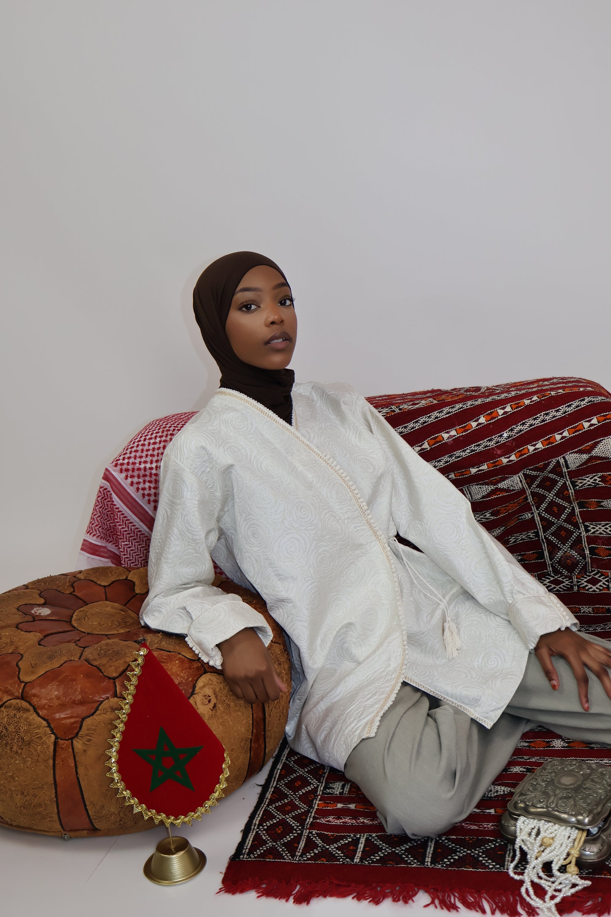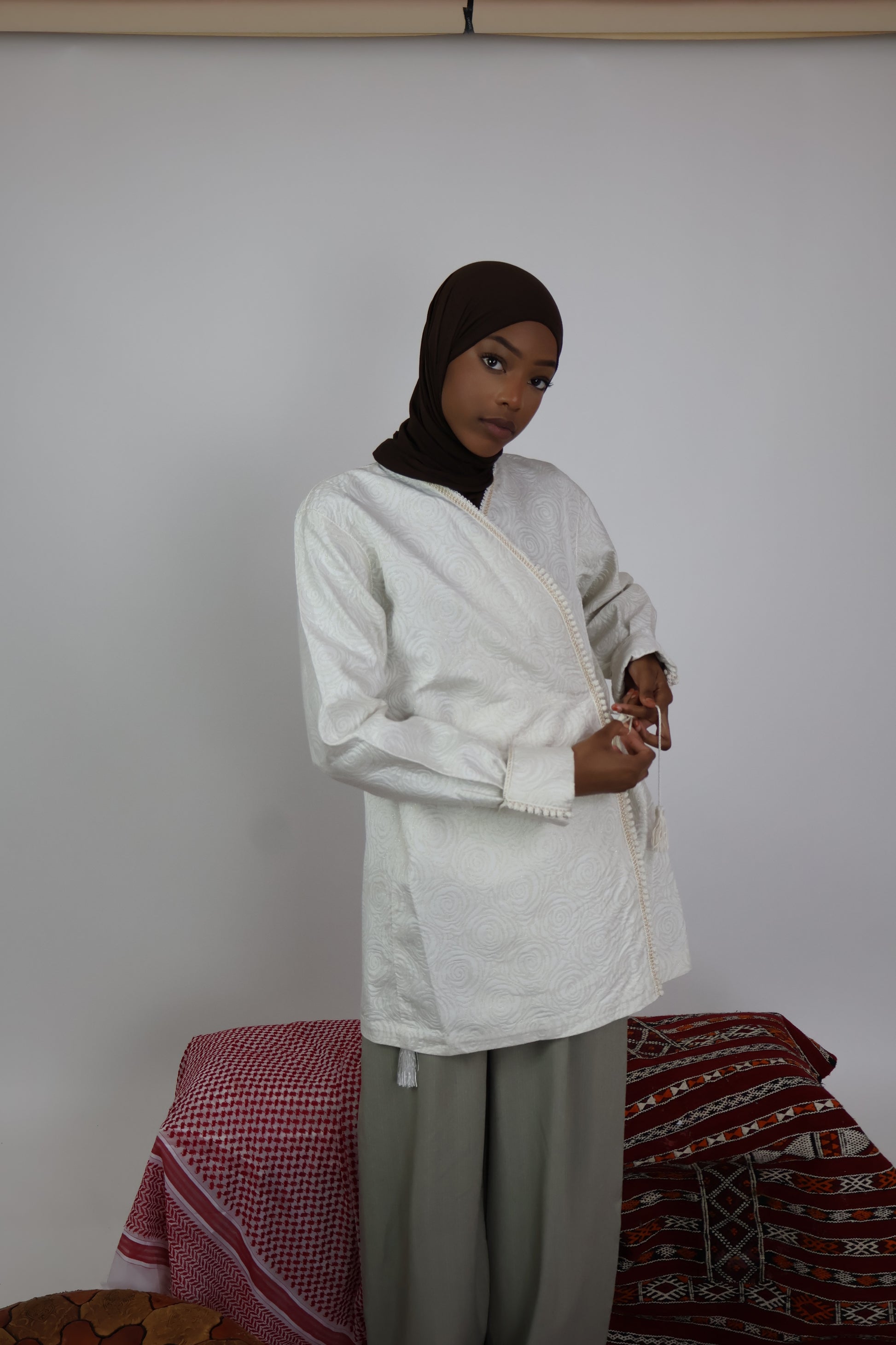 Confectionné dans un tissu brocard lumineux aux reflets subtils, il se distingue par ses motifs légèrement en relief qui captent la lumière à chaque mouvement. Sa coupe droite et fluide met en valeur toutes les morphologies jusqu’à la taille L, grâce à sa forme ample et confortable.