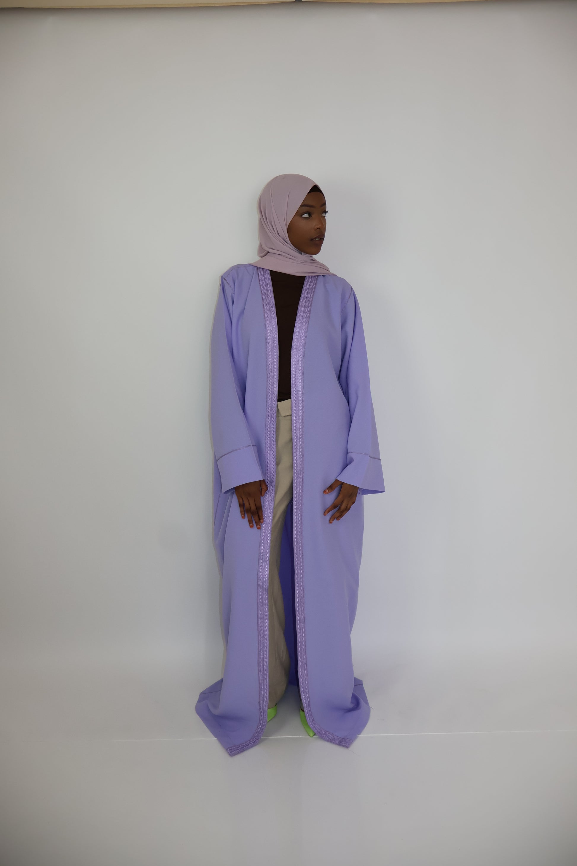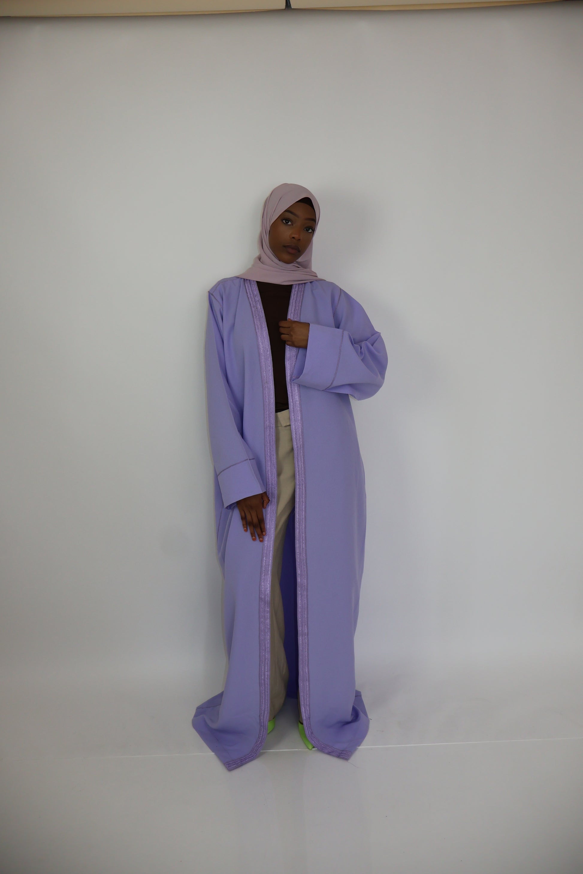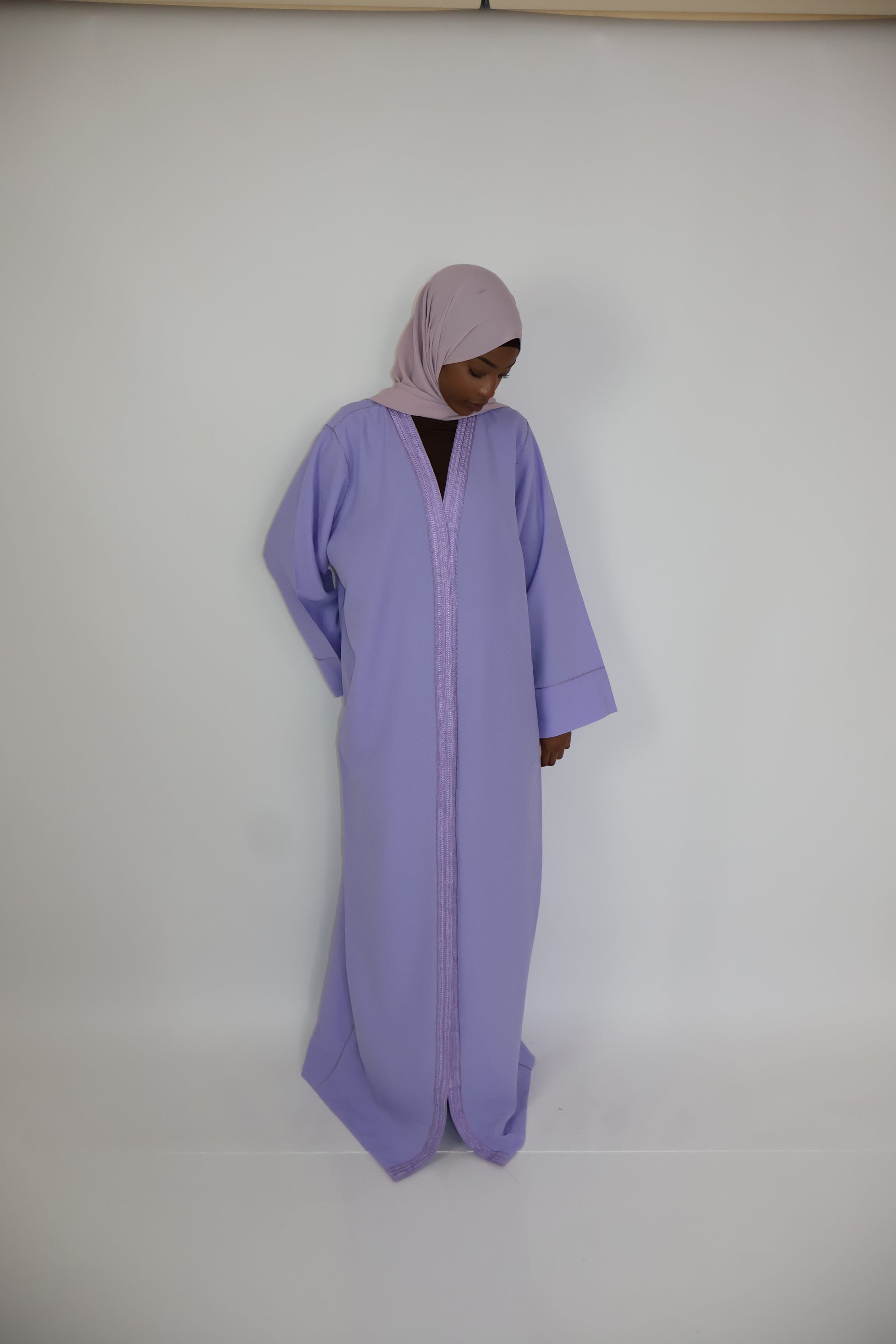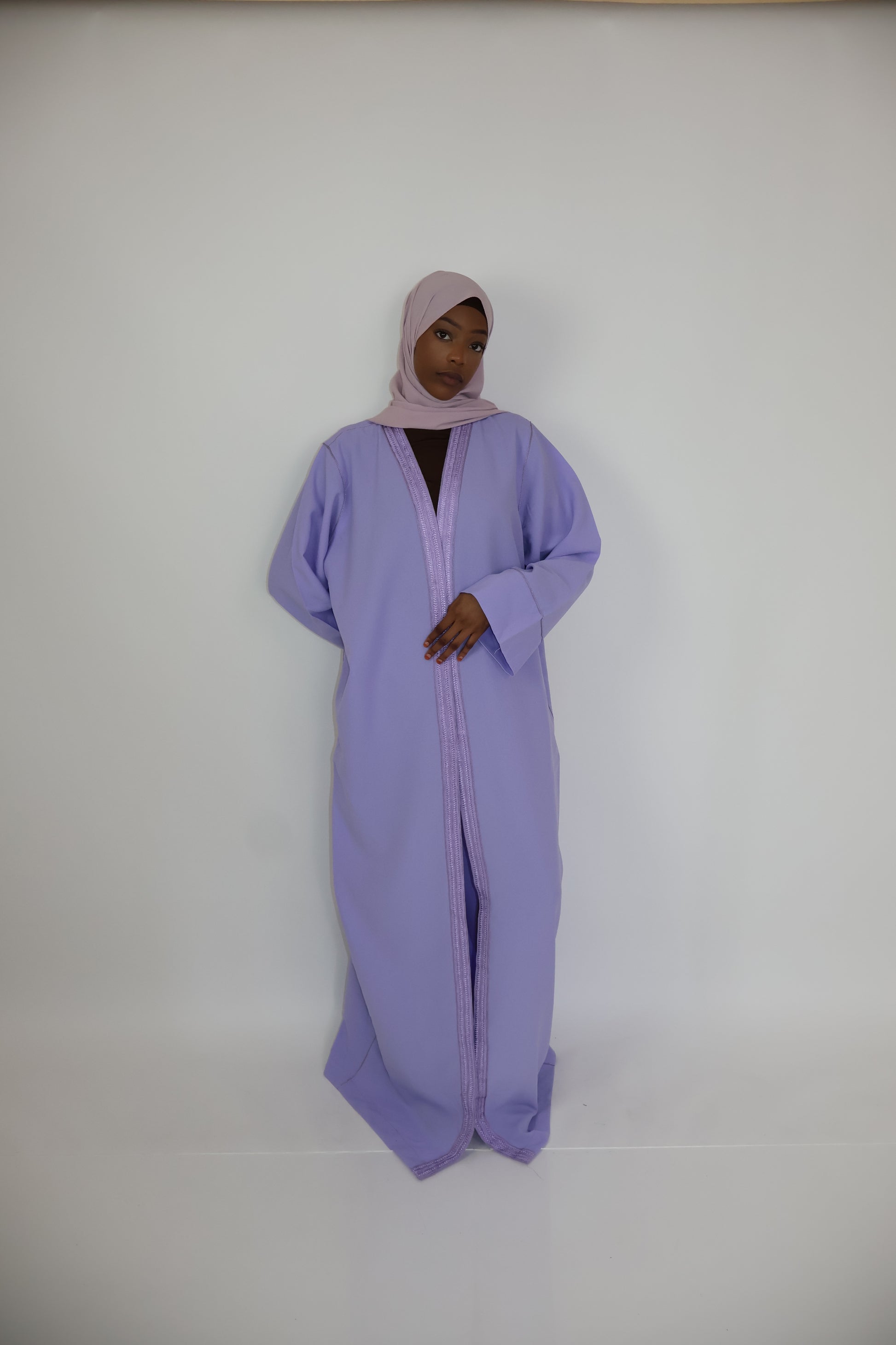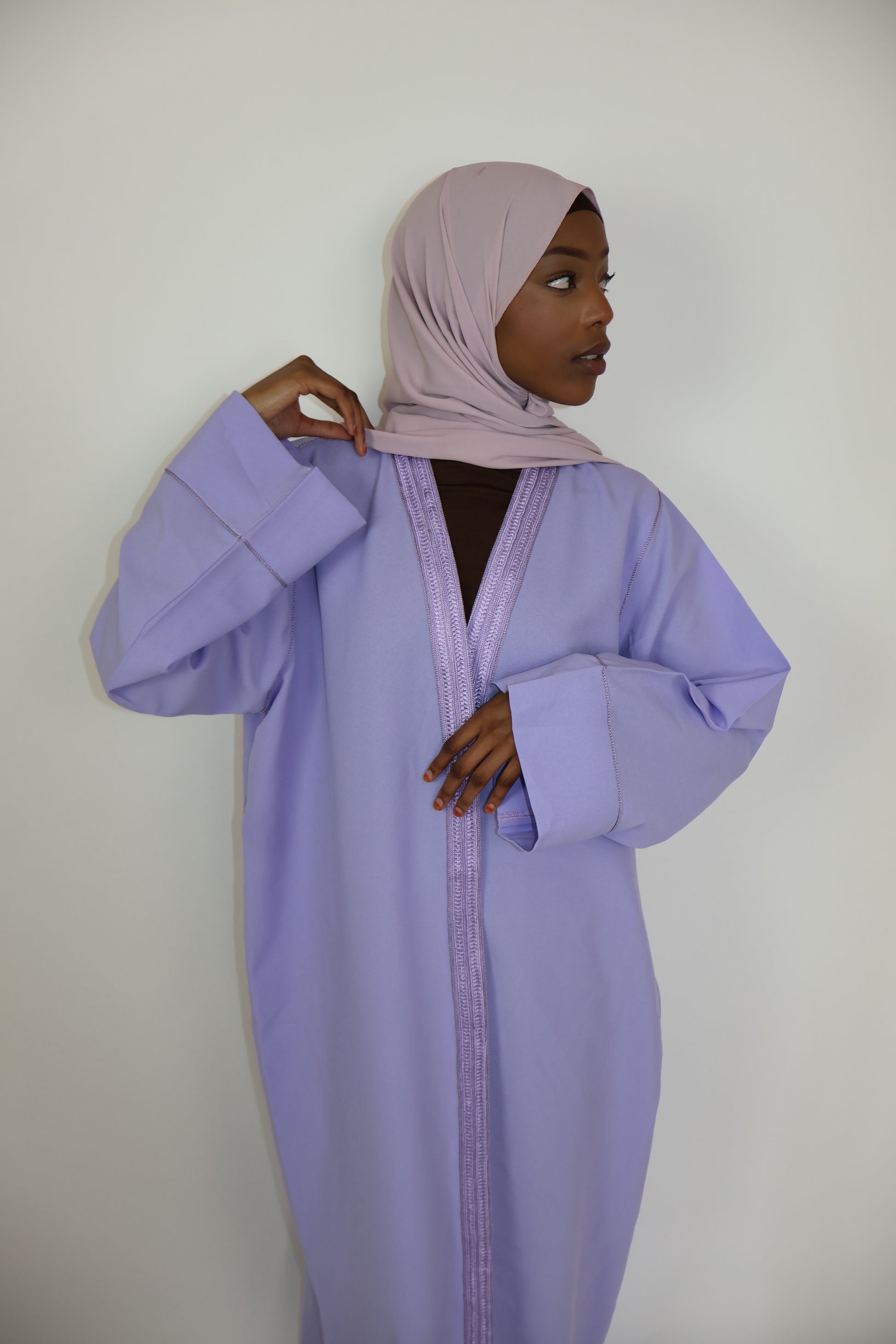 Ce kimono lila en crêpe de soie est spécialement conçu pour les grandes tailles. Sa coupe ample et fluide assure un confort optimal tout en mettant la silhouette en valeur. La sfifa traditionnelle ajoute une touche d’élégance marocaine à cette pièce légère et agréable à porter.