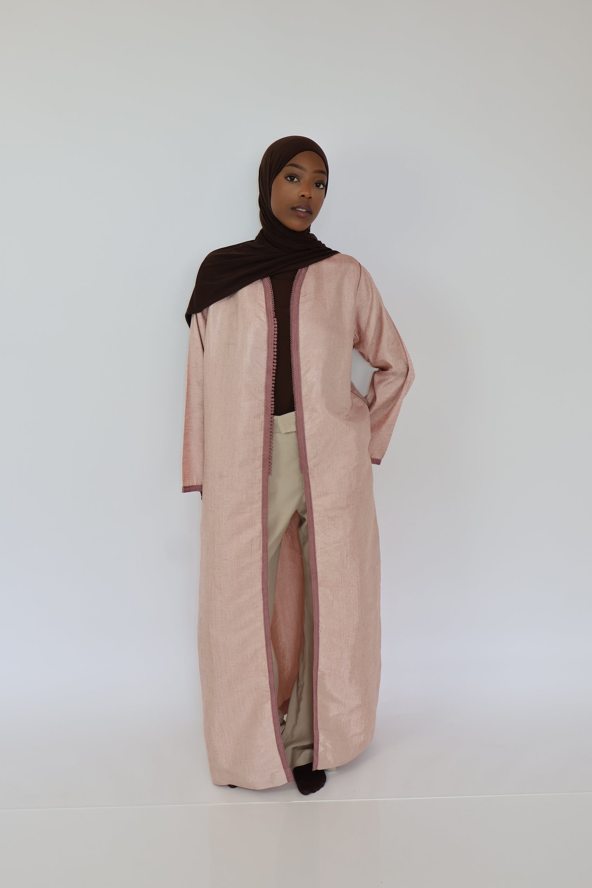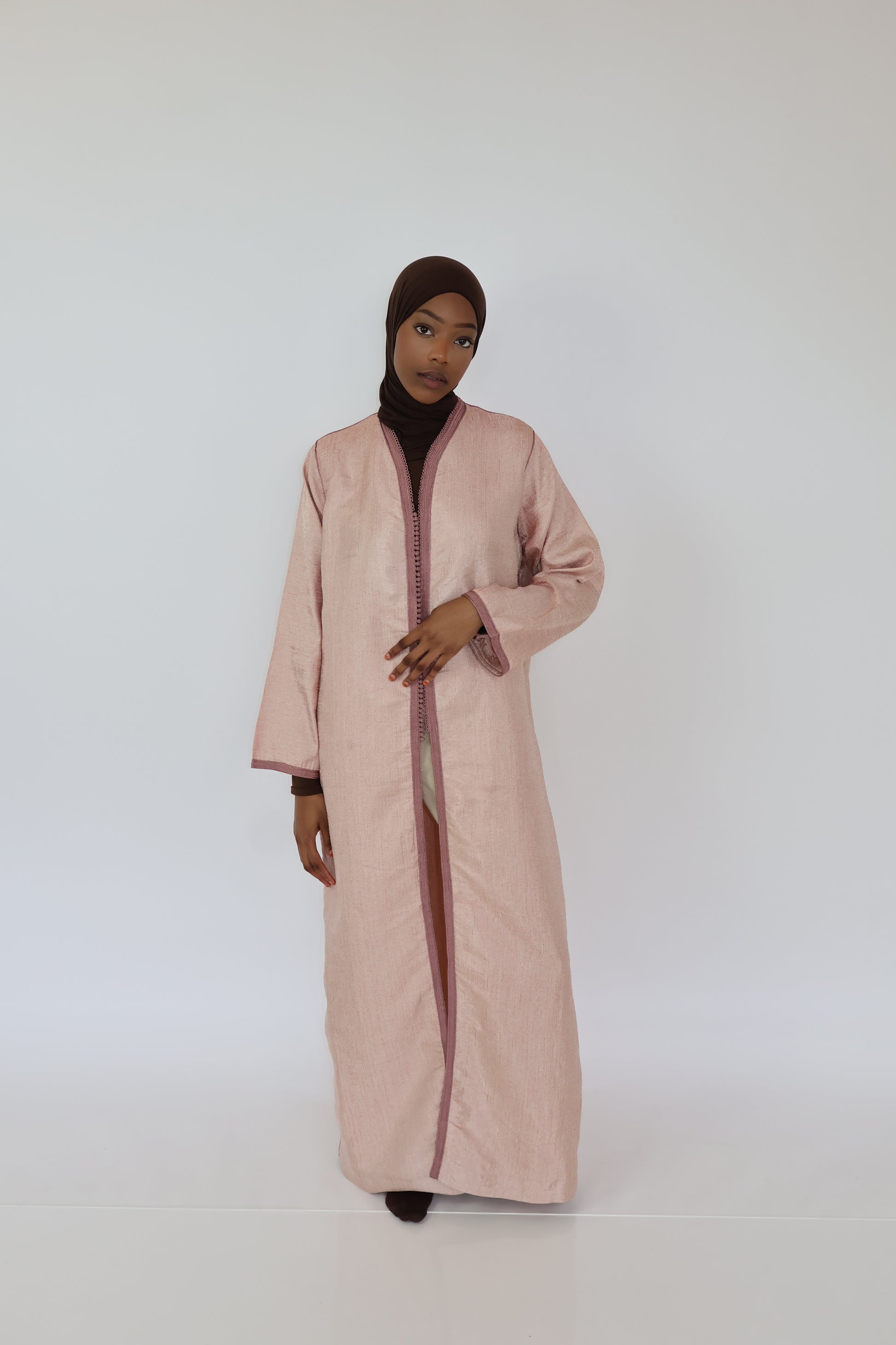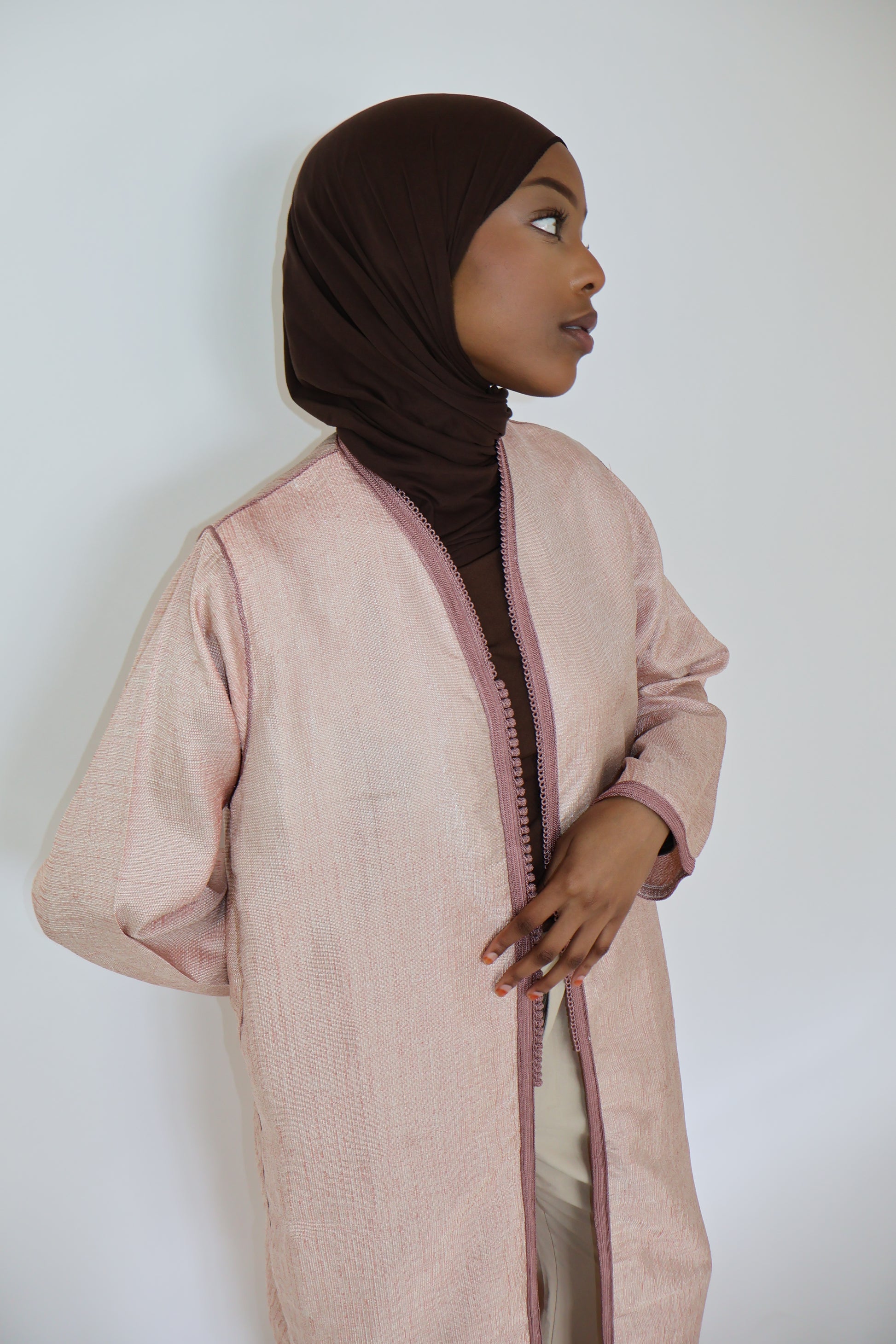 Léger, raffiné et délicatement orné, ce kimono rose en taille S est une pièce idéale pour les silhouettes fines ou les petites tailles (jusqu’à 1m65). Sa coupe fluide épouse subtilement les formes sans les alourdir, tandis que la sfifa traditionnelle lui apporte une touche artisanale marocaine, chic et intemporelle.