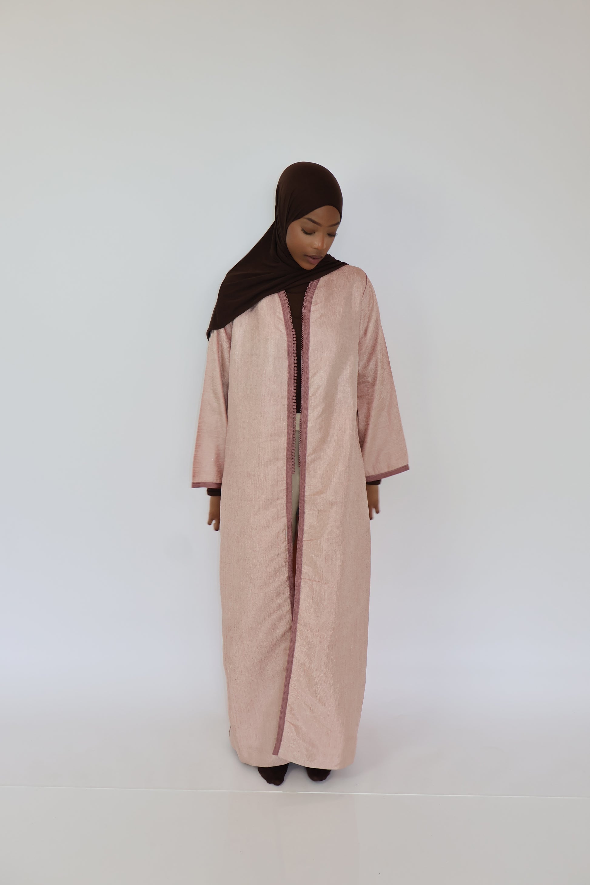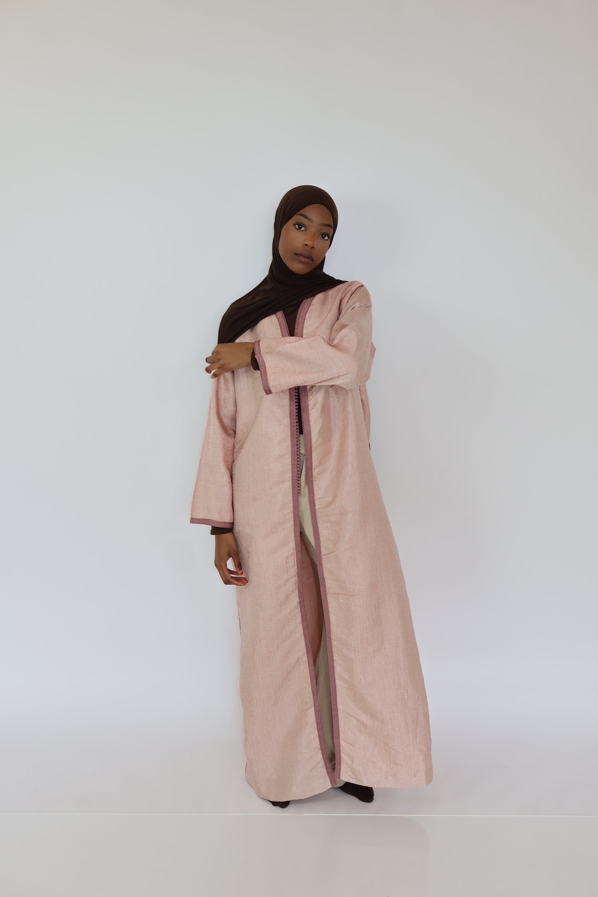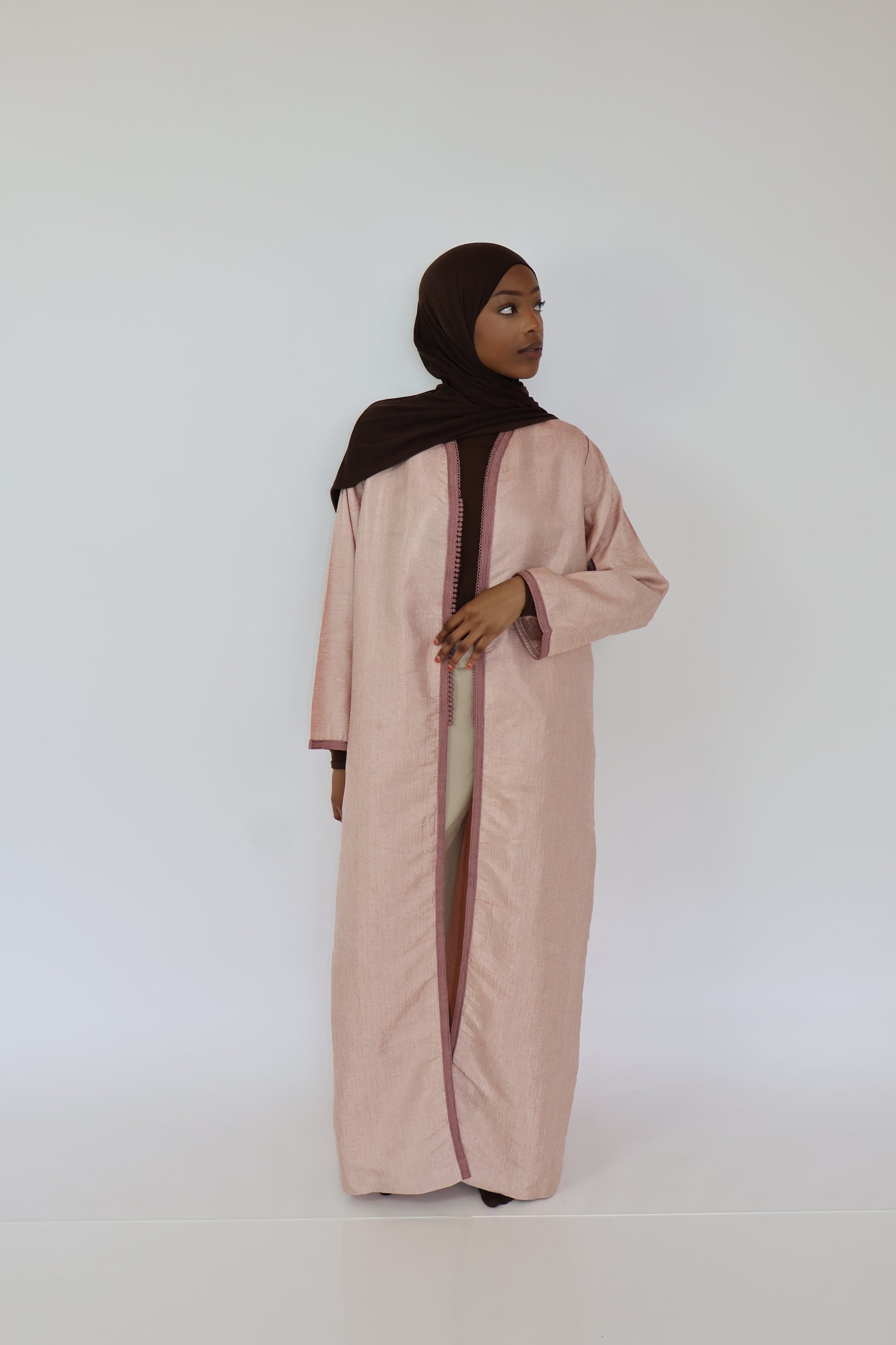 Léger, raffiné et délicatement orné, ce kimono rose en taille S est une pièce idéale pour les silhouettes fines ou les petites tailles (jusqu’à 1m65). Sa coupe fluide épouse subtilement les formes sans les alourdir, tandis que la sfifa traditionnelle lui apporte une touche artisanale marocaine, chic et intemporelle.