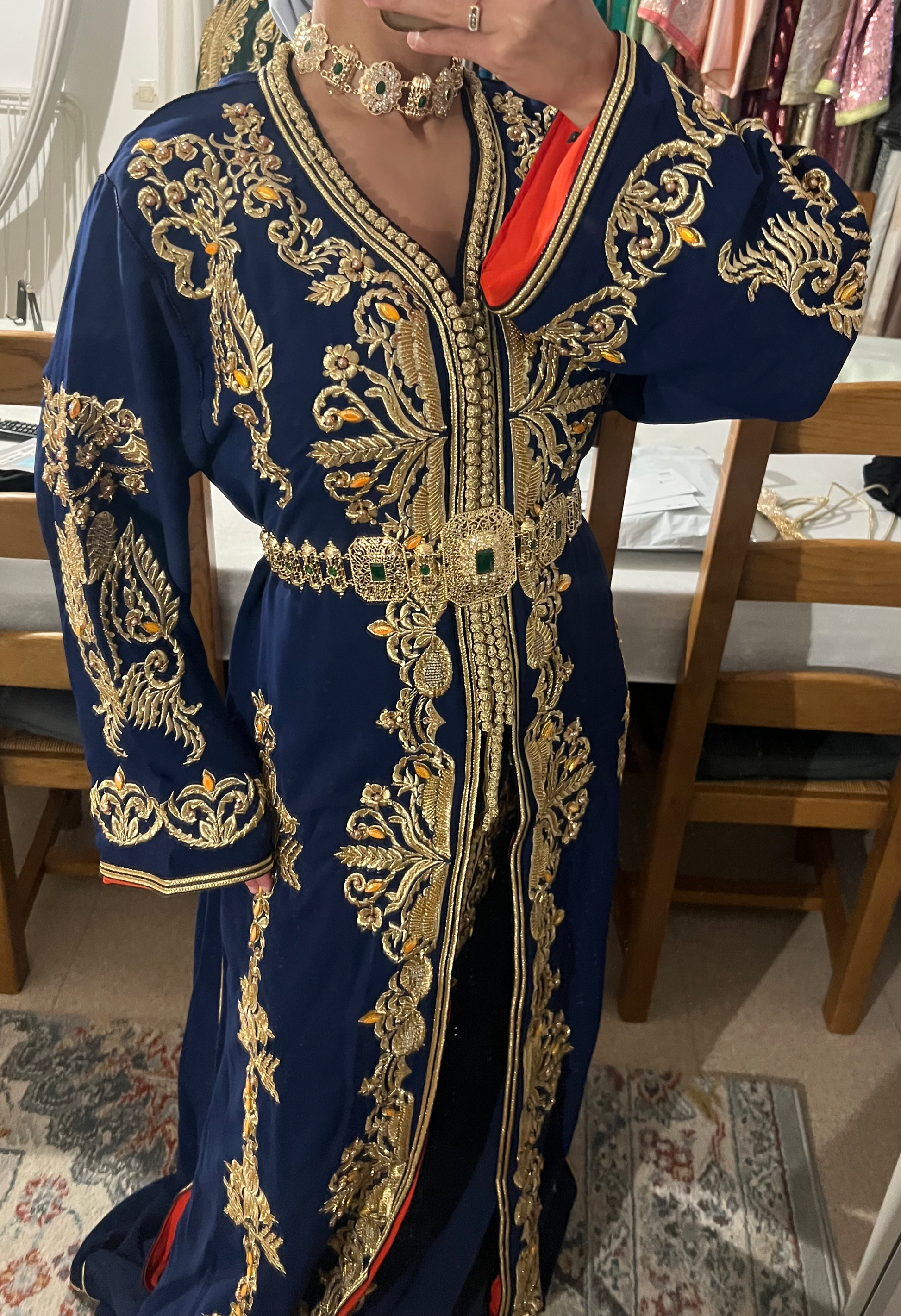 Sublime takchita en bleu marine, ornée de broderies dorées et touches de orange pour une élégance raffinée. La ceinture assortie souligne délicatement la taille, offrant une silhouette majestueuse. Parfaite pour les mariages et grandes occasions.