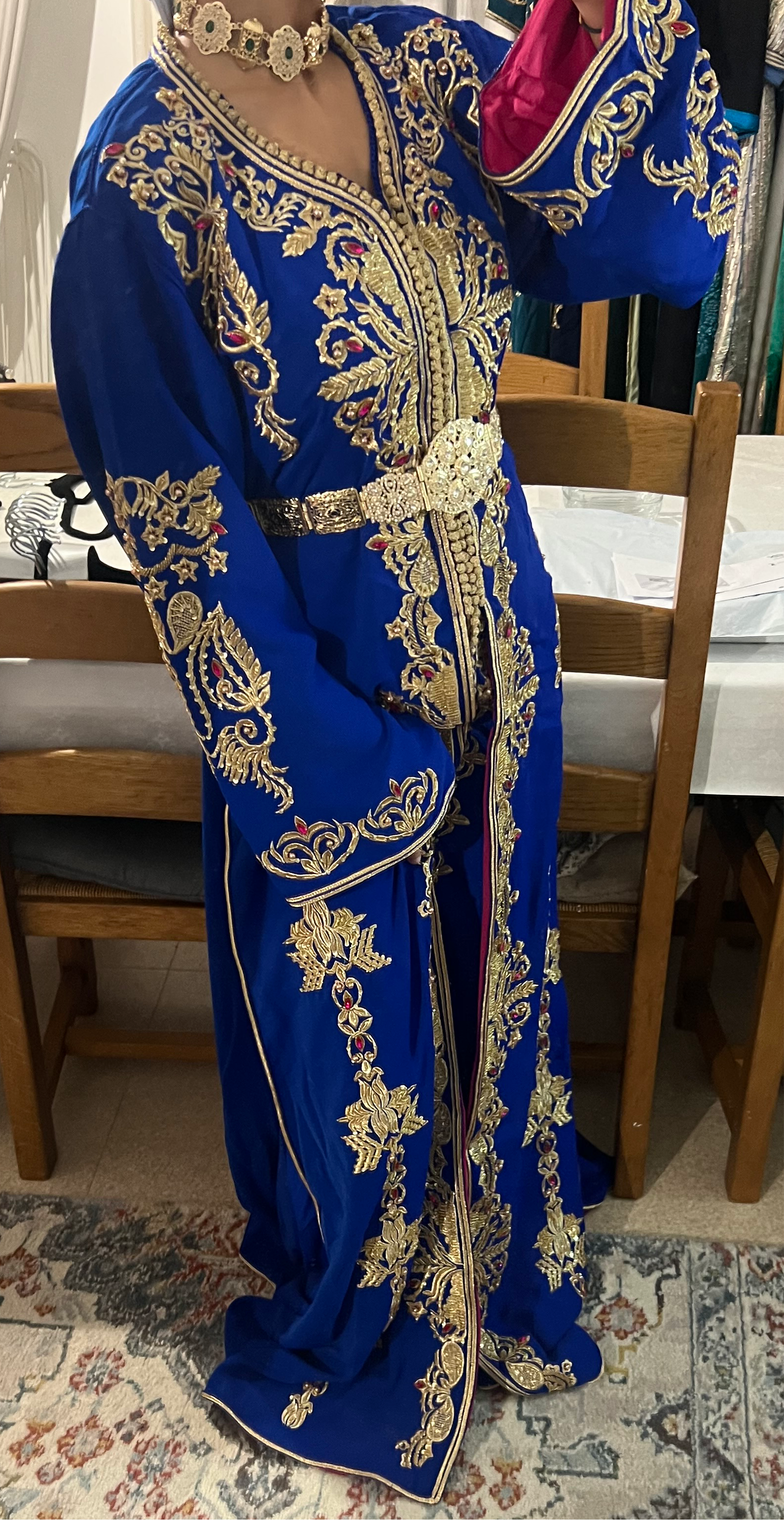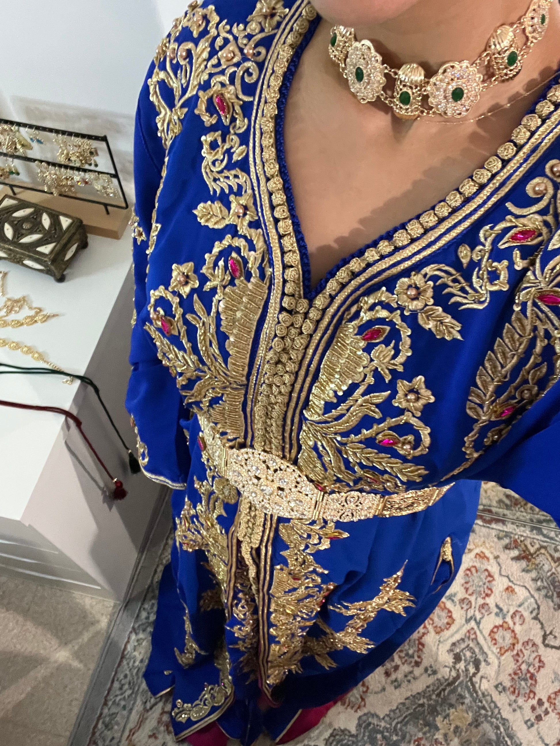 Sublime takchita en bleu royal, ornée de broderies dorées et touches de rose pour une élégance raffinée. La ceinture assortie souligne délicatement la taille, offrant une silhouette majestueuse. Parfaite pour les mariages et grandes occasions.