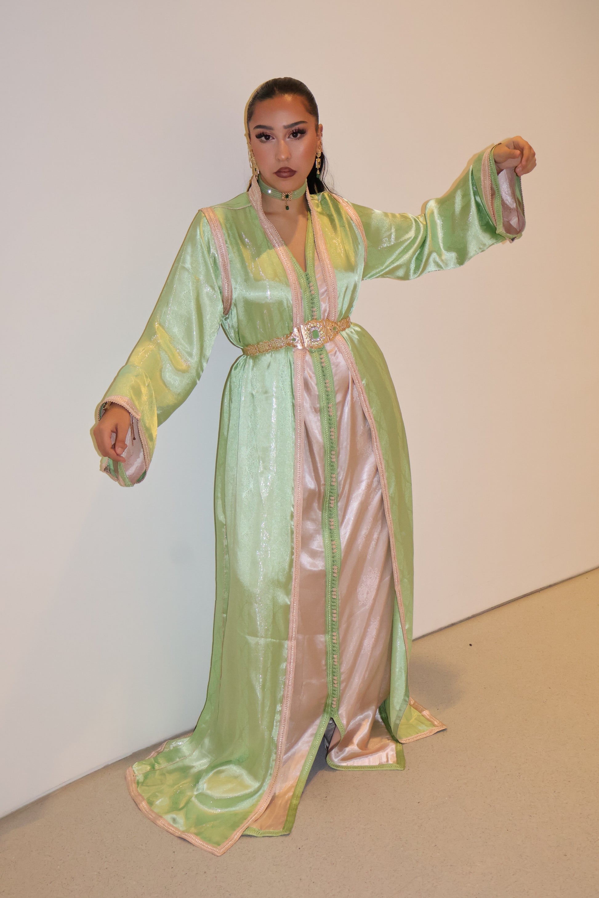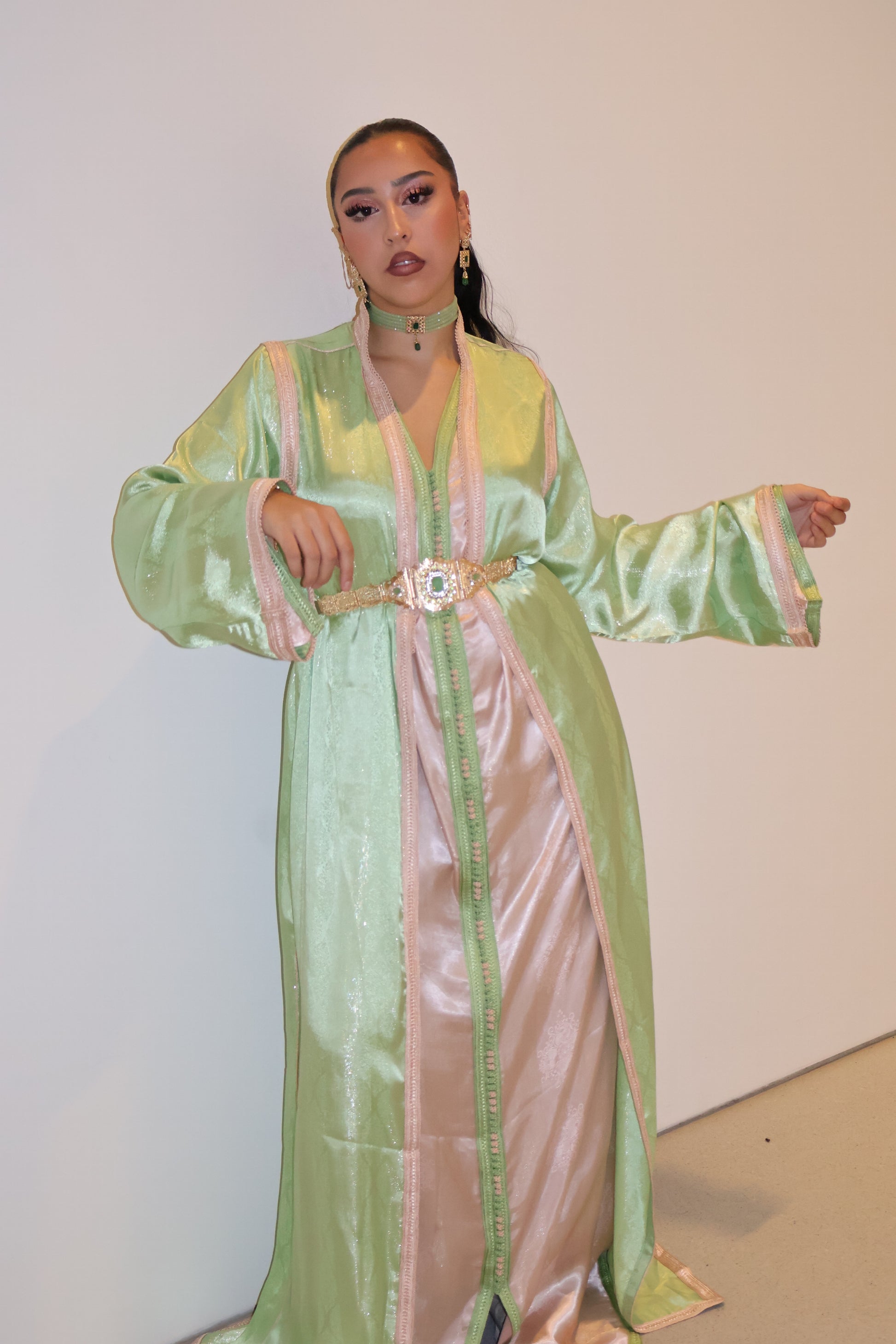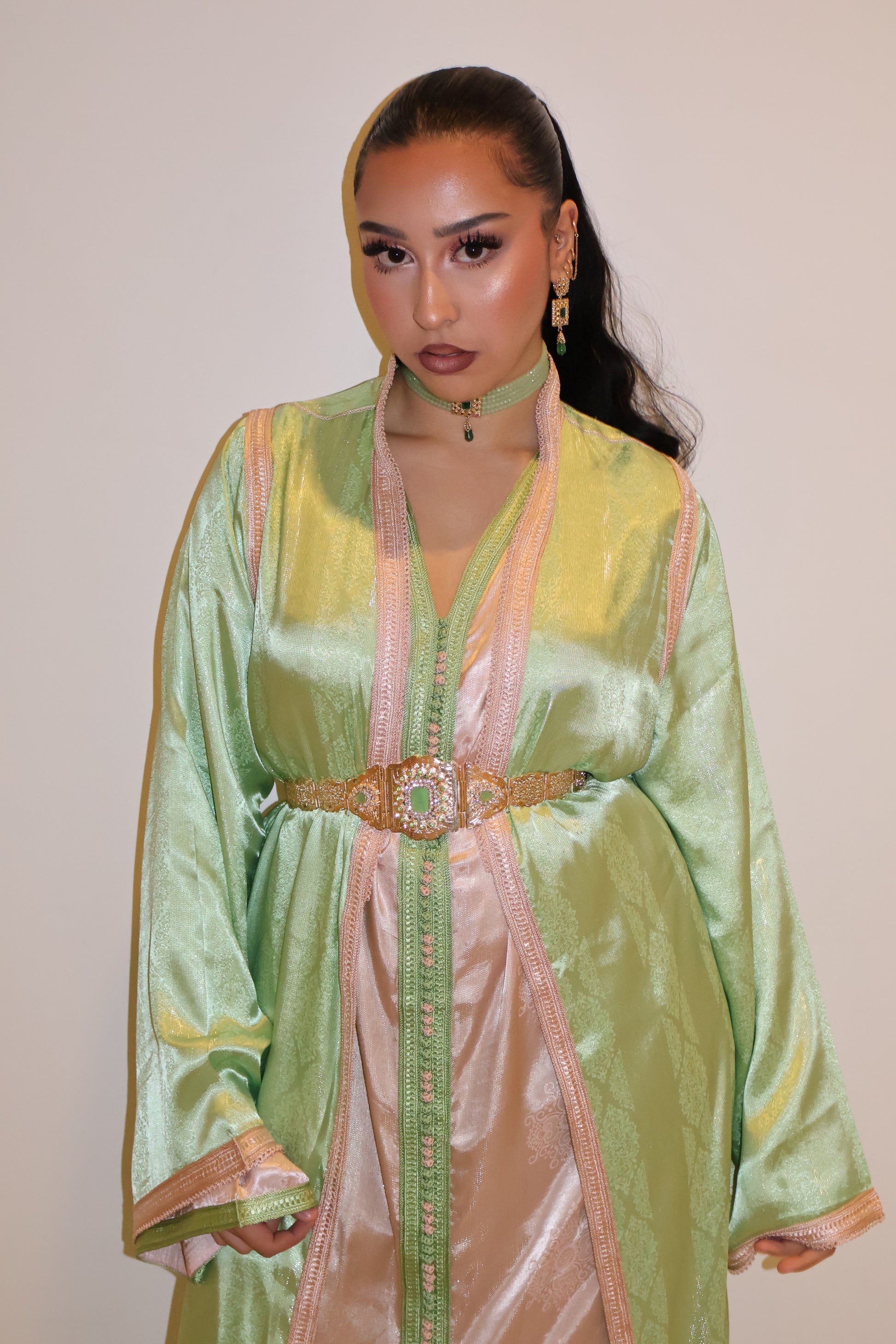 Ce caftan vert tendre aux détails roses délicats incarne l'élégance et la finesse. Orné d'une ceinture richement décorée qui souligne la taille, il associe parfaitement tradition et modernité. Taille unique, il s'adapte avec grâce à toutes les silhouettes, offrant une touche de sophistication idéale pour les événements spéciaux.